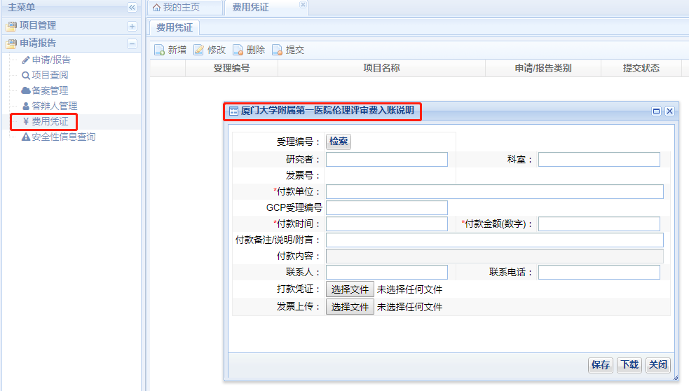 需要收取倫理審查費(fèi)用的項(xiàng)目倫理秘書在系統(tǒng)受理后會(huì)填寫《倫理審查費(fèi)通知單》并由系統(tǒng)發(fā)送,請(qǐng)按照《倫理審查費(fèi)通知單》上的要求匯款,應(yīng)特別注意匯款時(shí)按倫理要求備注項(xiàng)目資料的受理號(hào),財(cái)務(wù)打款后請(qǐng)及時(shí)在下圖所示界面中填寫倫理審評(píng)費(fèi)入賬說明,并上傳匯款憑證,以便順利的領(lǐng)取發(fā)票。