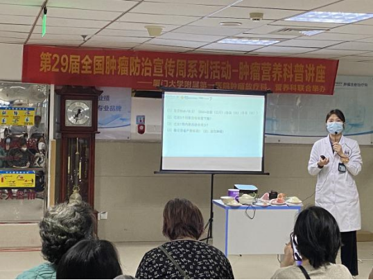 眾所周知,惡性腫瘤是一種消耗性疾病,營養(yǎng)是腫瘤治療的重要組成部分,科學(xué)、合理的飲食可以改善患者的營養(yǎng)狀況,防止?fàn)I養(yǎng)不良及腫瘤惡液質(zhì)的發(fā)生,增強(qiáng)患者體質(zhì)、改善生存質(zhì)量,但很多腫瘤患者、家屬及普通群眾容易陷入諸多飲食誤區(qū)。4月13日,廈門大學(xué)附屬第一醫(yī)院腫瘤放療科與營養(yǎng)科攜手舉辦“腫瘤放療患者的營養(yǎng)科普”講座。來至營養(yǎng)科的李淑楨營養(yǎng)師現(xiàn)場(chǎng)向腫瘤患者及家屬科普了腫瘤營養(yǎng)的重要性及腫瘤患者常見的飲食誤區(qū)并結(jié)合實(shí)物模型形象生動(dòng)的教會(huì)患者如何進(jìn)行飲食搭配。宣教會(huì)后更是有答疑解惑環(huán)節(jié),來至腫瘤放療科的林慧娟護(hù)士長與營養(yǎng)科李淑楨營養(yǎng)師對(duì)病患及家屬提出的各種疑問進(jìn)行詳細(xì)、耐心解答,引導(dǎo)患者、家屬進(jìn)行正確健康的飲食,獲得現(xiàn)場(chǎng)病患及家屬的一致好評(píng)。