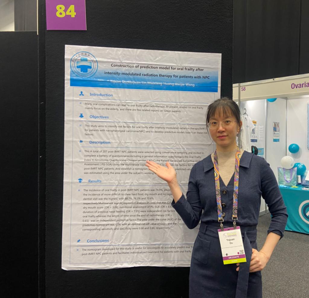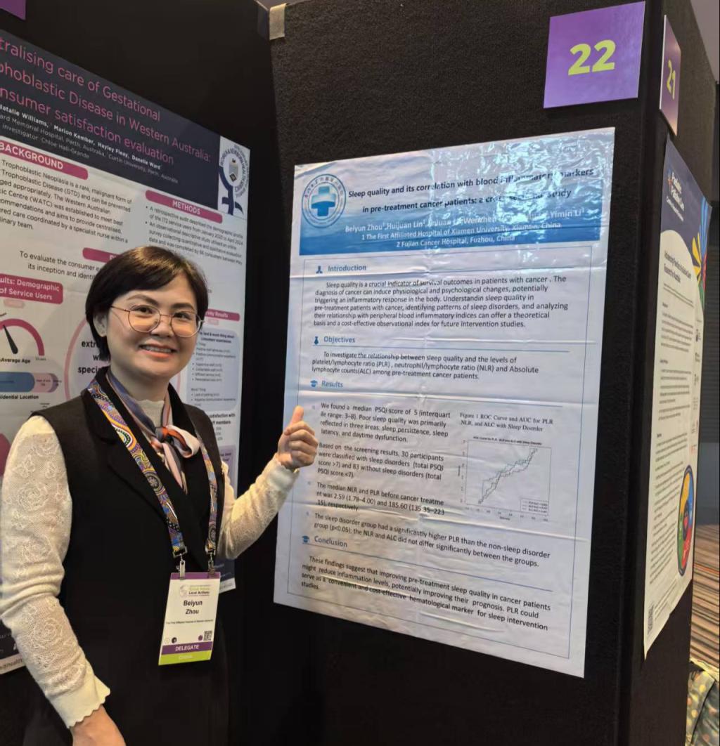 會上,廈門大學附屬第一醫(yī)院腫瘤放療科護理團隊杜亞娟副護士長的一篇題為“Construction of prediction model for oral frailty after intensity-modulated radiation therapy for patients with NPC”的論文壁報展示介紹了團隊針對鼻咽癌患者放療后口腔衰弱的發(fā)生情況及相關影響因素進行研究、為相關臨床干預提供了研究基礎;周貝蕓副主任護師的一篇題為“Sleep quality and its correlation with blood inflammatory markers in pre-treatment cancer patients: a cross-sectional study”的論文作為壁報展示,探討了癌癥患者治療前的睡眠質(zhì)量與外周血炎癥指標的關系,為建立潛在的睡眠質(zhì)量觀察標記及針對腫瘤患者睡眠健康的未來干預提供了參考信息。這些成果在腫瘤學中具有重要的臨床價值,有助于改善治療反應,優(yōu)化患者管理,提高癌癥患者的整體生活質(zhì)量。此次國際交流汲取了國內(nèi)外同仁在腫瘤篩查、癥狀護理、導航護理、護理教育等方面的寶貴經(jīng)驗,也促進我院腫瘤護理與國際的學術交流及知識共享。