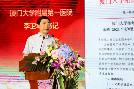 12日晚上,慶祝大會(huì)在醫(yī)院室外廣場(chǎng)舉行。廈門市總工會(huì)黨組成員、副主席朱秀敏,廈門市衛(wèi)生健康委員會(huì)醫(yī)政醫(yī)管處處長(zhǎng)陳洪濤,廈門大學(xué)醫(yī)學(xué)院沈曲、朱杰敏副教授,廈門醫(yī)學(xué)院護(hù)理學(xué)系余惠琴主任,院黨委書記李衛(wèi)華、院長(zhǎng)王占祥、副院長(zhǎng)樂家振等全體院領(lǐng)導(dǎo)及護(hù)理老前輩鄭玉琴主任、王美招主任、白蓮枝護(hù)士長(zhǎng)、部分臨床職能科室主任、護(hù)士代表等共計(jì)400余人參加紀(jì)念活動(dòng)。本次慶祝活動(dòng)由樂家振副院長(zhǎng)主持。