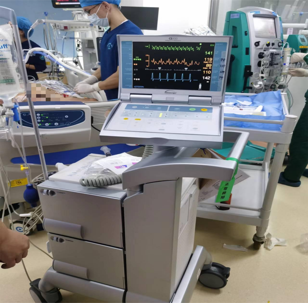 患者的心臟衰竭速度之快,讓在場(chǎng)的醫(yī)生都感到震驚。血流動(dòng)力學(xué)嚴(yán)重不穩(wěn)定,每一分鐘都可能是生死之別。待ECMO小組醫(yī)生護(hù)士趕到后,看著病床上年輕的生命。當(dāng)機(jī)立斷,緊急上機(jī),龔華峰快速地裝管、預(yù)沖,與醫(yī)生緊密配合,緊急為患者上機(jī)。ECMO開(kāi)始運(yùn)轉(zhuǎn)的那一刻,所有人都松了一口氣。但病魔并未就此退縮,患者的生命征依然不穩(wěn)定。此時(shí),ECMO小組的領(lǐng)隊(duì)又做出了一個(gè)決定:為患者進(jìn)行IABP。