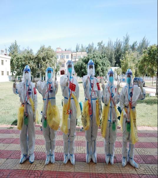 我們是鐵一樣的隊伍。海南地處熱帶,屬熱帶季風(fēng)氣候,素來有“天然大溫室”的美稱,正值8月,平均氣溫在30以上,路上熱浪騰騰,連空氣都是熱烘烘的,盛夏的陽光像是蘸了辣椒水般讓人無法躲避。還記得在第一批隊員出征前,隊員們對我說“隊長,放心吧,我們決不能讓你失望,保證完成任務(wù)”,看著一個個可愛的大白坐上小摩托就這樣前往村落當中,我的內(nèi)心有種孩子離家出遠門的忐忑與不安。大約過了2個多小時,我接到了一個隊員的電話,電話那一頭開口說:“隊長,對不起,我現(xiàn)在堅持不住了,頭很痛,我可能沒有辦法再做下去了,我請求歸隊”,我此刻心像被針扎一樣難受,他們沒有一句的怨言。隨后便連接到了隊員的電話,第一批隊員們陸續(xù)趕回來,每一位隊員見到我都是滿滿的愧疚感,看著他們濕透的全身,慘白的面容,發(fā)白褶皺的雙手,深深的口罩勒痕,各個都有不同程度中暑的表現(xiàn),在脫衣區(qū)嘔吐,那一刻我真的繃不住了,瞬間淚目,沒有人知道防護服下的他們在經(jīng)受著怎樣的考驗,是什么信念支撐著他們,可能這就是白衣天使的責(zé)任與擔當吧。