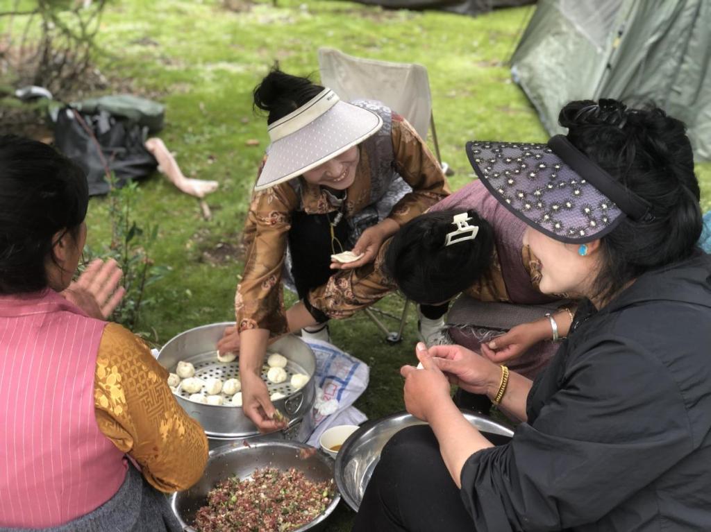 藏族同胞邀請(qǐng)我們?nèi)ド缴喜萜核巫?。他們是個(gè)大家庭,兄弟姐妹六七人,孩子們也有十幾個(gè)。他們搭起了很大很漂亮的帳篷,帶上被褥、炊具、照明器具等,在風(fēng)景秀麗的山野草地駐扎好幾天。女人們?cè)诎笈H獍?,炊煙一簇簇升起;孩子們追逐嬉戲著,有的跟著音?lè)有模有樣跳起了鍋莊;男人們則接待客人,飲酒作樂(lè)。