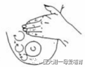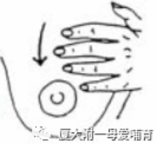 c.以此按摩方式環(huán)繞整個(gè)乳房逐新朝向乳暈方向進(jìn)行。