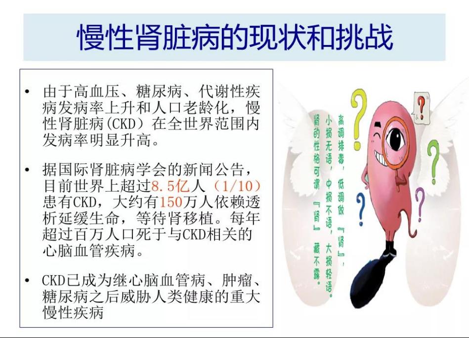慢性腎臟病是我國乃至世界范圍內(nèi)一種常見病,《柳葉刀》的一項研究顯示:我國成人慢性腎臟病患病率高達10.8%。截止到2017年,我國患病人數(shù)達1.323億,這就意味著每10個人中就有一個腎臟病患者。