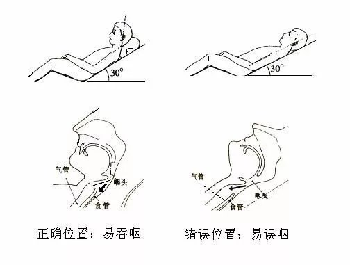 吞咽時(shí)通過頭頸等部位的姿勢調(diào)整,可使吞咽通道的走向、腔徑大小和某些吞咽器官組成結(jié)構(gòu)的位置有所改變和移動避免誤吸和殘留,消除嗆咳等癥狀。一般認(rèn)為進(jìn)食最佳體位為坐位或半臥位,進(jìn)食體位一般采取軀干與地面成30°以上角度最安全。