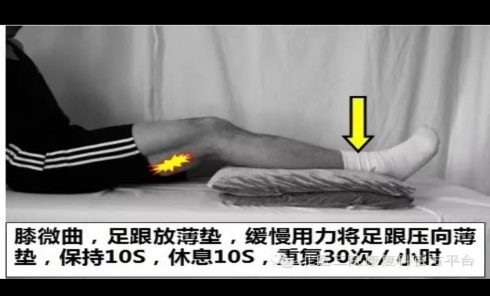 ·方法:膝微屈,足跟放薄墊,緩慢用力將足跟壓向薄墊,保持10秒,做10個(gè);