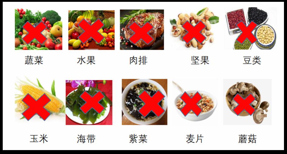 不能吃含粗纖維、顏色深的食物,特別是帶渣、帶籽的食物和水果。如圖。