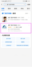 1、 打開“支付寶”APP,搜索“廈門醫(yī)療保障”小程序,選擇如上圖矩形框中的“廈門醫(yī)療保障”小程序。
