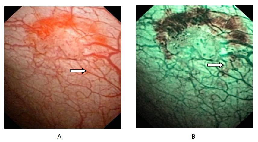 白光與NBI的圖像對比,在A圖中,腫瘤周圍的微小病變顯示不清(箭頭所指處),而在B圖中卻顯示得非常清晰,可見NBI對于早期不典型病變的顯示明顯優(yōu)于普通白光。