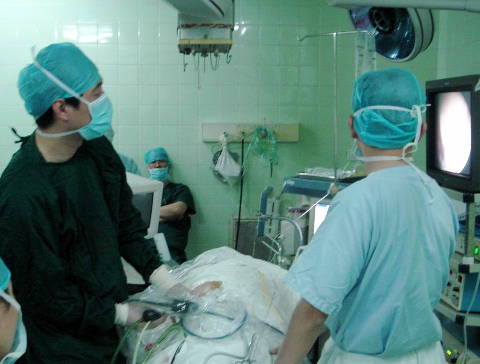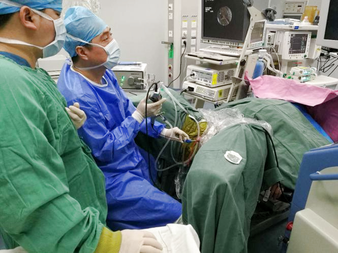 王惠強(qiáng)主任操作經(jīng)皮腎鏡手術(shù)中