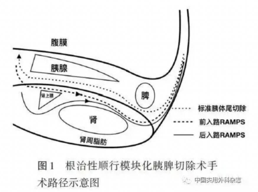 胰體尾癌發(fā)病隱匿,惡性程度高,5年存活率不足8%,根治性手術仍是惟一可能治愈的手段。1913年,Mayo醫(yī)學中心首次報道遠端胰腺聯(lián)合脾臟切除治療胰體尾癌,這一傳統(tǒng)手術方式一直沿用至今。標準胰體尾切除術具有較高的后腹膜切緣陽性率,但擴大胰腺切除或擴大淋巴結清掃也并未明顯改善病人預后,且可能增加術后并發(fā)癥發(fā)生率,因而未能得到推廣。直至2003年,Strasberg團隊通過對傳統(tǒng)遠端胰腺切除術進行一系列技術改良而提出的根治性順行模塊化胰脾切除術(radical antegrade modular pancreatosplenectomy,RAMPS)改變了這一現狀,其研究結果顯示,RAMPS較傳統(tǒng)根治術可明顯降低后腹膜切緣陽性率,從而提高R0切除率,進而改善病人預后。