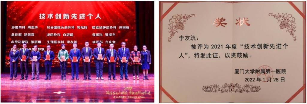 2021年,我科克服疫情影響,醫(yī)教研全面發(fā)展,臨床工作再創(chuàng)新高,試管嬰兒取卵周期增長20%,成功率繼續(xù)位居省內(nèi)前列。在學科建設、科研成果等方面收獲頗豐。在學科建設方面:李友筑入選第六批廈門市青年創(chuàng)新創(chuàng)業(yè)人才(A類),是本批次唯一入選A類的醫(yī)學人才;李友筑連任《中華生殖與避孕雜志》通訊編委、新?lián)沃袊詫W會女性生殖醫(yī)學分會常務委員、《醫(yī)學參考報生殖醫(yī)學??肪幬?;科室舉辦第四屆鼓浪聽濤”暨吳階平醫(yī)學基金會生殖醫(yī)學專委會胚胎學論壇;舉辦第一屆“鳳凰花開”暨福建省醫(yī)學會生殖醫(yī)學分會胚胎學沙龍。在新技術(shù)新項目開展方面:李友筑帶領(lǐng)團隊完成的《單精子冷凍新技術(shù)在男性非梗阻性無精癥患者IVF-ET周期中的臨床應用研究》項目榮獲2020—2021年度廈門市十大醫(yī)療創(chuàng)新技術(shù)。在科研教學方面:生殖醫(yī)學科2021年度發(fā)表二十余篇文章,其中五分以上3篇,十分1篇,取得專利3項,其中發(fā)明1項;參編人衛(wèi)專著1部;參編中華醫(yī)學會指南2項。2021年度獲科研立項3項,其中吳榮鋒獲批國自然面上1項;李友筑帶領(lǐng)團隊完成的《人類卵母細胞玻璃化冷凍方法體系的優(yōu)化及評估卵子質(zhì)量新方法的探索》項目獲福建省科技進步三等獎和廈門市科技進步三等獎;李友筑帶領(lǐng)團隊完成的《人類輔助生殖技術(shù)中提高胚胎發(fā)育潛能的相關(guān)基礎和臨床研究》項目獲全國婦幼健康科技成果三等獎。吳榮鋒、周衛(wèi)東和顏曉紅等作為重要參與者完成的《內(nèi)外環(huán)境因素在子宮內(nèi)膜異位癥發(fā)生發(fā)展中的作用機制及臨床應用》項目榮獲福建省科技進步二等獎和廈門市科技進步三等獎。