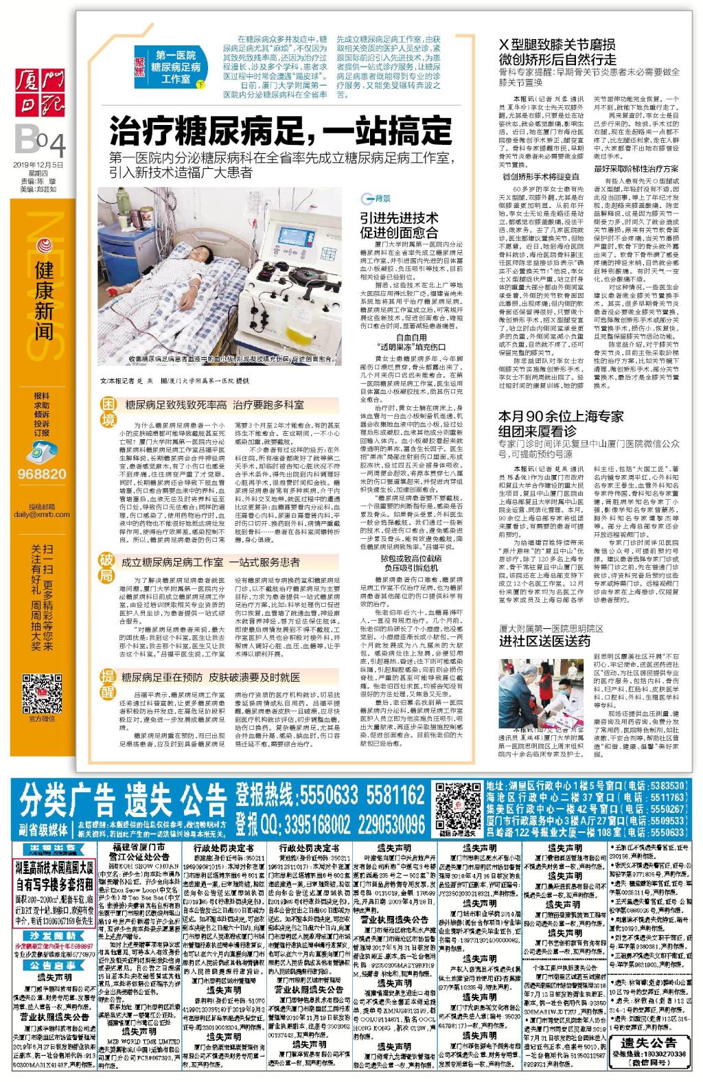 廈門大學(xué)附屬第一醫(yī)院糖尿病內(nèi)分泌科在全省率先成立糖尿病足病工作室,輸血科引入新技術(shù)造福廣大患者。糖尿病足,可謂糖友們聞之色變的“敵人”,經(jīng)久難愈、持續(xù)潰爛的創(chuàng)口是不少人揮之不去的噩夢,血小板作為一種多功能細(xì)胞,不僅在血栓形成和止血中發(fā)揮作用,而且在血管發(fā)生、組織修復(fù)和炎癥過程中也扮演著重要的角色。自體富血小板凝膠( Autologous platelet-rich gel,APG)系取自患者自身外周靜脈血,經(jīng)離心、分離、濃縮制得的富血小板血漿( Platelet-rich plasma,PRP),將其按一定比例與凝血酶-鈣(10:1)混合凝固形成的凝膠狀物質(zhì)。由于它不僅具有加速止血、封閉創(chuàng)面的特點(diǎn),而且含有豐富的生長因子,能加速創(chuàng)面愈合,其已在創(chuàng)傷修復(fù)領(lǐng)域得到廣泛應(yīng)用,我院糖尿病內(nèi)分泌科和輸血科引進(jìn)國內(nèi)先進(jìn)的自體富血小板凝膠,負(fù)壓吸引等技術(shù),可使糖年病足患者“一站式”就醫(yī),糖尿病皮膚潰瘍,由于神經(jīng)病變、供血不足,局部組織降解過度,衰老細(xì)胞增多,對細(xì)胞信號的反應(yīng)性下降,導(dǎo)致對一般治療的低應(yīng)答性。在外源性因素(如外傷、感染)的侵襲下,創(chuàng)面常難以愈合而形成慢性不愈性潰瘍。PRP技術(shù)在治療糖尿病足領(lǐng)域是一個(gè)新的方向,目前已成為慢性或急性創(chuàng)面的輔助治療手段之一,其在治療慢性創(chuàng)面中有很好的前景,今后會(huì)成為糖尿病足慢性潰瘍治療的必不可少重要手段之一。
